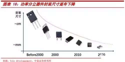 功率分立器件和功率模组的封装工艺演化趋势相同,都是向器件小型化、大功率应用、高能量效率方向进展。