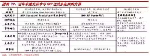 建广收购 NXP 标准部门完成交割,填补国内汽车、工业 IC 空白继 2015 年以 18 亿美元的金额成功收购恩智浦的 RF Power(大功率功放管)部门之后,近日建广资产主导的中国半导体行业最大一笔海外并购案也顺利交割,建广资产以 27.5 亿美元收购恩智浦(NXP)标准件业务,该部门主营业务为分立器件、逻辑芯片和 PowerMOS 芯片等产品。此次收购的顺利完成,标志着建广资本有望成为我国半导体业规模最大且利润最高的 IDM(垂直一体化)企业。