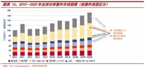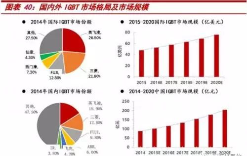 中国功率半导体市场占世界市场的 50% 以上,但在新能源汽车、轨道交通等中高端 MOSFET 及 IGBT 主流器件市场上, 90% 主要依赖进口,基本被国外欧美、日本企业垄断。IGBT 是新能源汽车及充电桩等设备的核心技术器件。据 IHS 预测,到 2020 年全球 IGBT 市场规模可以达到 80 亿美元,年复合增长率约 10%,国内市场规模将超 200 亿元,年复合增长率约为 15%,具备广阔的国产替代空间。