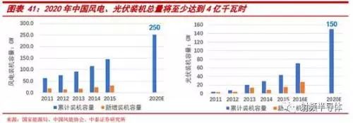 功率半导体是节能减排的关键器件和基础技术,广泛应用于新能源汽车、光伏发电、风电等产业。根据规划,「十三五」期将优先发展分散式风电和分布式光伏发电,力争在 2020 年风电装机规模达到 2.5 亿千瓦时左右,发电成本低廉,与煤电基本相当;光伏发电装机规模达到 1.5 亿千瓦左右,力争实现用户侧平价上网。2020 年风电和光伏并网总容量至少要达到 4 亿千瓦。