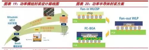 功率模块几乎应用于所有大功率工业产品中,各种应用领域的不同要求使得功率模组每一部分都面临改进创新。从封装工艺上来看,加装基板的功率模块是一种标准设计(约占 70%—80%), DBC (直接覆铜工艺)是应用最广泛的封装工艺,这种工艺封装的模块通常复杂昂贵。未来功率半导体封装工艺将向更加优异的 Fan-out 封装发展。