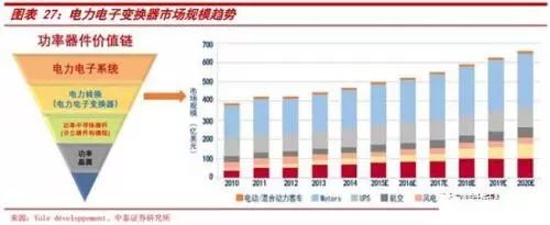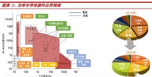 据市场调研机构 Yole dé veloppement 预测,至 2020 年电力电子变换器市场 CAGR 约为 6%,其中工业电机驱动和 UPS 稳压电源领域所占份额最大,新能源汽车领域具有最高增长率。