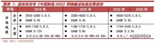 2015 年 5 月,国务院发布《中国制造 2025》重点领域技术路线图,预计至 2030 年,中国集成电路市场规模占全球的比例将达到 43.35%—45.64%,中国将成为世界最大的 IC 产业链设计、制造基地,在诸多优势领域达到世界先进水平。其中提到大力推动电力装备这一重点领域的突破发展,包括对大功率电力电子器件这一关键元器件的开发。