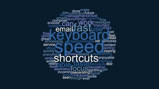 把用户反馈放入到词云图之后,出现了一些相同点:喜欢我们产品的用户最欣赏Superhuman的快速、重点和键盘快捷键。