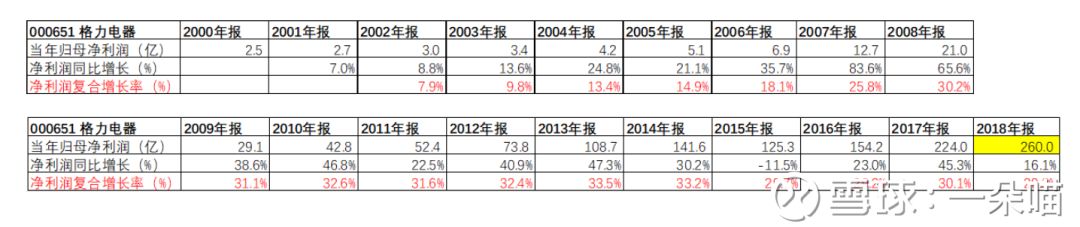自2000年以来,格力电器的归母净利润从2.5亿,增长到了2018年的260亿(预告),足足增长了104倍,复合年化增长率约为29.3%。