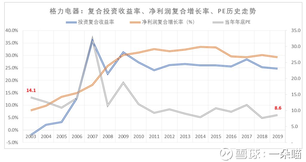 图1 格力电器复合投资收益率、归母净利润复合增长率、PE历史走势图(2003-2019):