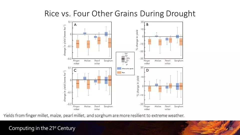 大数据和机器学习可以帮助农民选择更合适的播种作物,来减少多变的气候对农业产量的威胁。研究者研究了印度种植的5种农作物的数据,小米、玉米、水稻、珍珠米和高粱。很多农民会大范围种植水稻,但是水稻对降水、气温、土壤等条件的变化都比较敏感,在遇到频繁气候变化时,在一种稻米上孤注一掷就可能导致国家的农业总产量下降,使得粮食供应受到影响。因此我们的研究对印度的作物种植多元化给出了一些建议,有助于抵御气候变化的不利影响。