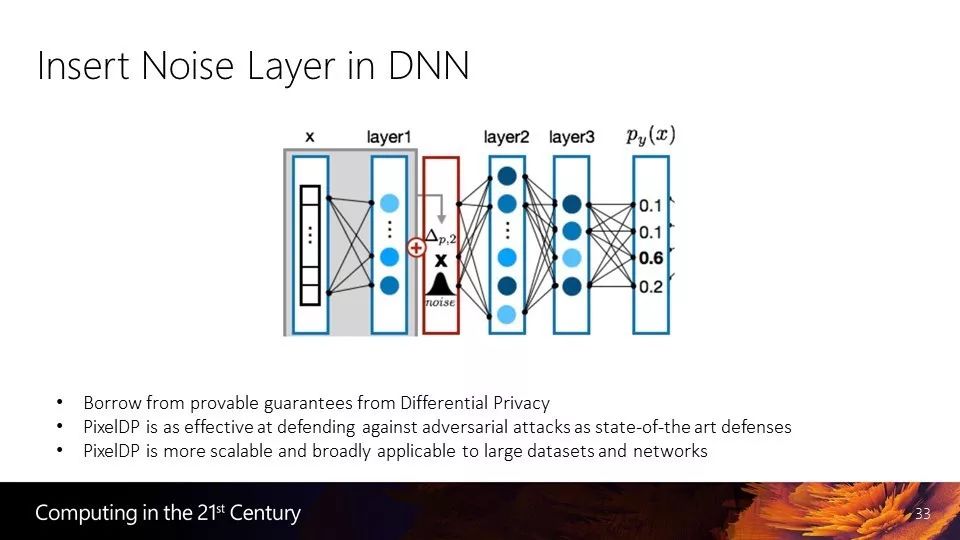 另一个项目 PixelDP,现在有很多研究都揭示出 DNN 的脆弱性,连非常简单的涂鸦都会改变 DNN 的分类结果,而在自动驾驶时如果认错了交通标识,可能会导致非常严重的后果。这个研究工作受到了差分隐私(differential privacy)的启发,这个理念来自于密码学,我们把它嫁接到机器学习中,试图使 DNN 更加强大,以应对图像中的污染等情况。我们给 DNN 增加了一个噪声层,可以确保将输入中污染的影响控制在一定范围内,让分类器不会认错。