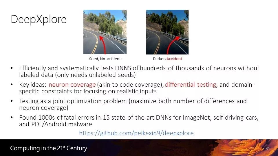 我想重点谈一下“S”,安全、保障与隐私。这个项目叫 DeepXplore,它是用编程语言和软件工程的方式去测试深度学习系统的一个白箱框架,通过神经元覆盖(neuron