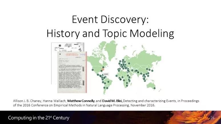还有一个完全不同的领域——历史。哥大历史系正在用机器学习模型、舆情分析等方式去分析历史文本,例如,每年历史系教授都会在美国政府发布的文件中搜集文本,比如搜集70年代外交官相互发的外交传电,通过分析和可视化这些文件,来理解70年代发生的历史事件。
