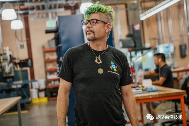 刚刚走过无人机的区域,我就找到了Astro Teller——他是Google X的负责人,也就是登月计划的总指挥。他的打扮有点像海盗,或许是他故意为之,就想要这种风格。他把黑发扎成一条长马尾辫,却蓄着银白的山羊胡。他上身一件长袖T恤,下身深色牛仔裤,脚蹬一双大号的黑色旱冰鞋。我问他,是下午刚刚滑过旱冰吗?“其实我在办公室大概98%的时间都这么穿。”他回答。我朝一位Goolge X的女公关望过去,想向她确认Teller这话是不是正经的回答。那位公关人员的表情告诉我:他当然就是这样。
