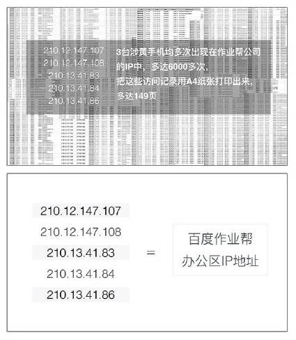 再一查,3台涉黄手机均多次出现在作业帮公司的IP中,多达6000多次。把这些访问记录用A4纸打印出来,多达149页。