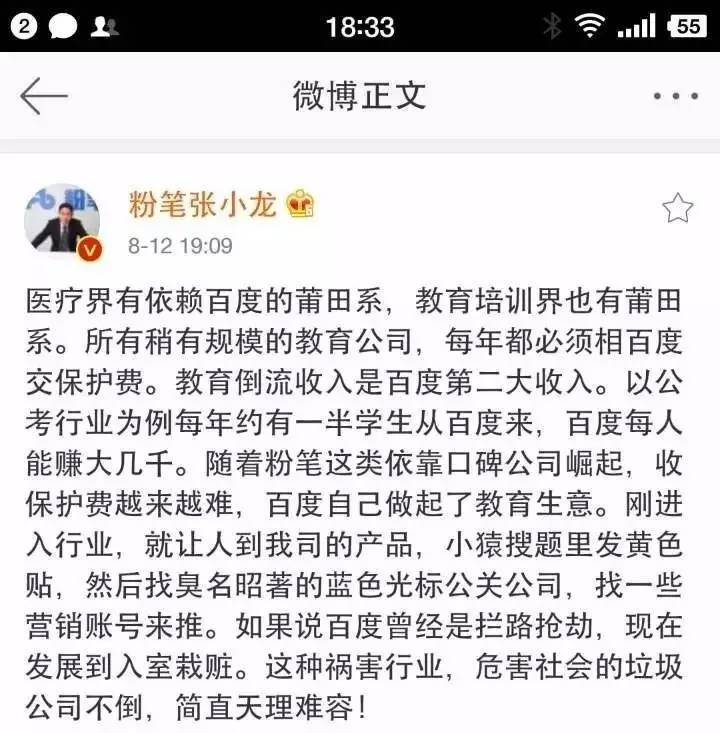 小猿搜题副总裁李鑫没有透露公关公司的名字,称跟这些营销号有过接触的就能知道是哪家公司。而粉笔网CEO张小龙则在微博上表示,这家公关公司叫蓝色光标。