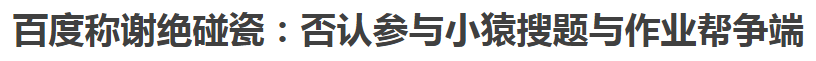 在题为《即使树大招风,依然谢绝碰瓷》的声明中,百度称,作业帮是拥有独立品牌、完全自主经营的企业实体,百度作为投资方之一,不参与作业帮日常运营。百度从未以任何形式参与此次小猿搜题与作业帮的争端。对于外界对“百度”品牌的肆意攻击无限,百度将运用法律武器维护权益。