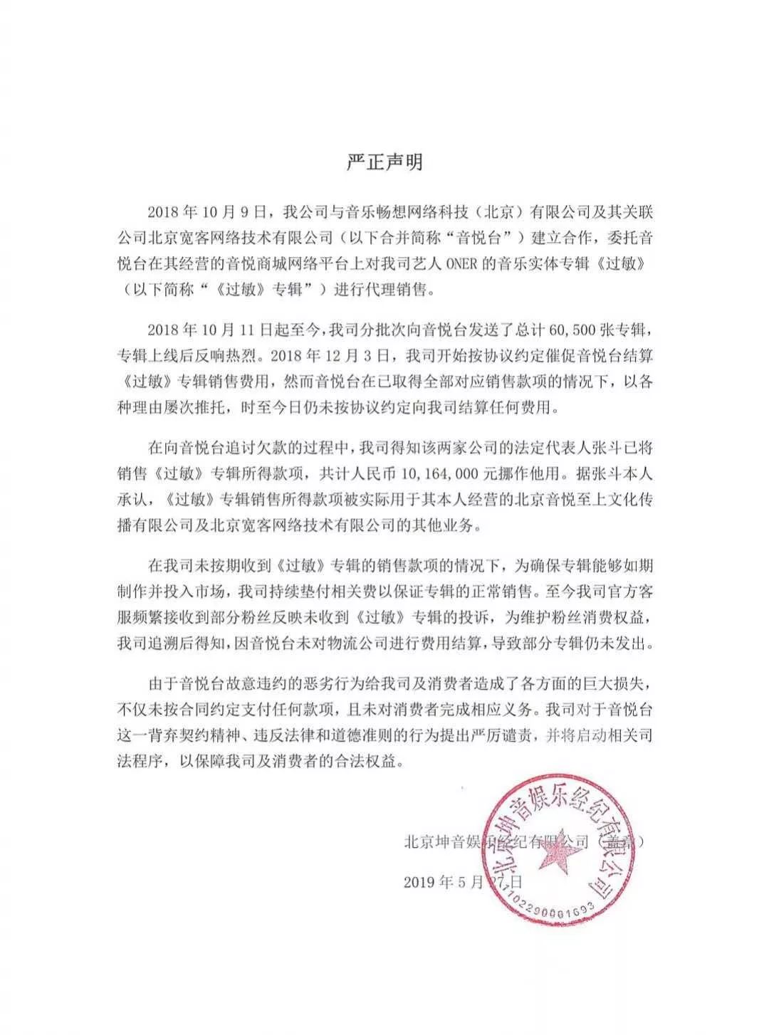 5月27日,多次催款无果的坤音娱乐官微发布音悦台欠款声明。