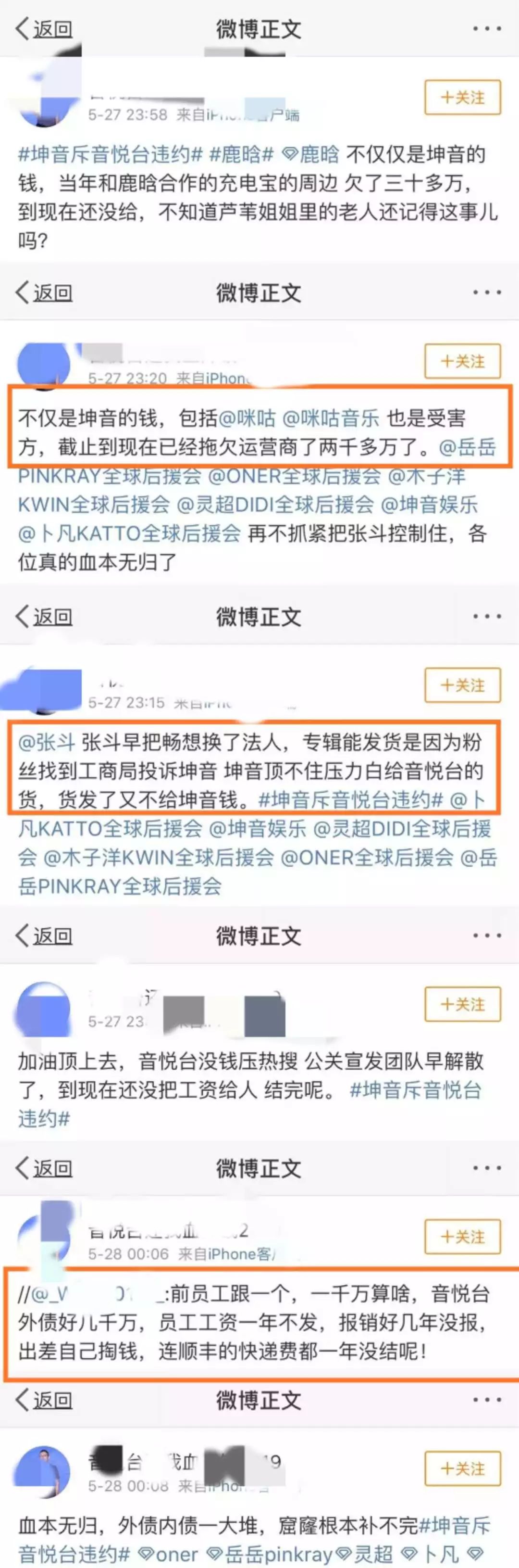 5月27日晚,随着“坤音斥音悦台违约事件”的发酵,多位音悦台前员工发微博表示,音悦台不仅挪用坤音专辑销售款,还严重欠薪员工,少则四五个月,多则十多个月工资未结。