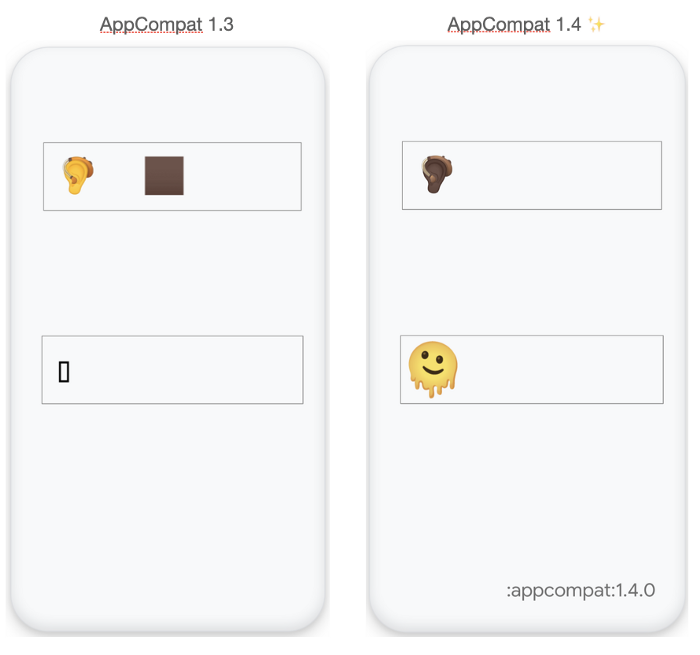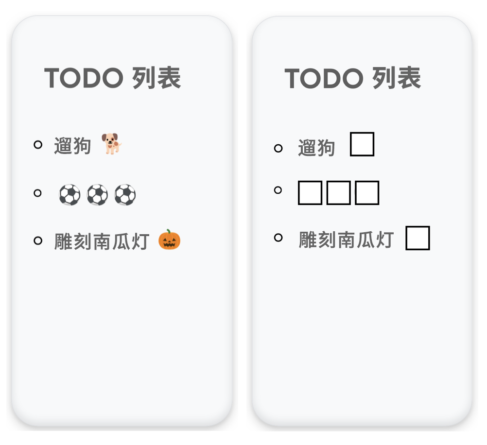 如果您的应用没有对 emoji 进行相应的处理,较早版本的 Android 可能不知道如何去显示它们。在大多数情况下,只会显示一个空白方格,我们称之为 "豆腐"。在未正确处理 emoji 的应用中,在原本应该显示 emoji 的位置将会显示出一个 "豆腐块",这可能会给用户带来困惑。例如,如果用户在 TODO 应用的任务列表里,向 EditText 中添加一个 🐶 表情,此时用户看到 "豆腐" 出现在屏幕上而没有显示输入的 🐶 表情时,用户则会认为应用存在 bug。