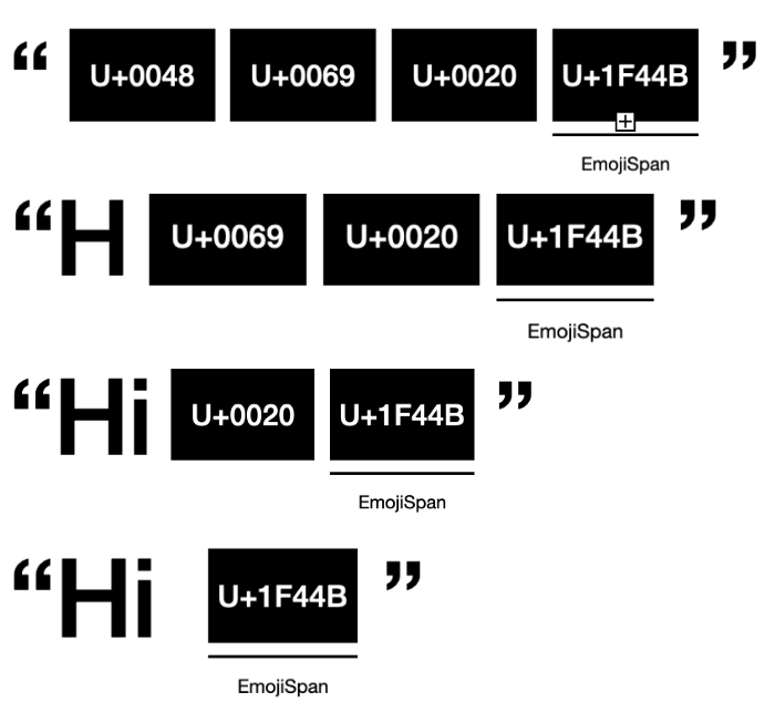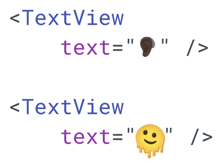 简单来说,图形化的 emoji 实际上只是显示在文本中的一个图片 🖼️ 。它通过 Unicode 码点来表示,如同字母 'e',但是 Unicode 规定: 当显示码点时,应显示 emoji 图片而非字母 'e'。这张图片仅是字体文件中的一个 png (更多内容请参阅我们为 Android 打造的 emoji 字体)。通常您可能认为字体内容就是字母 'e' 的笔画定义,但实际上字体的功能非常强大,可以包含 bitmap、png、svg,甚至完整的程序——有人在字体中实现了一个游戏 🤯。