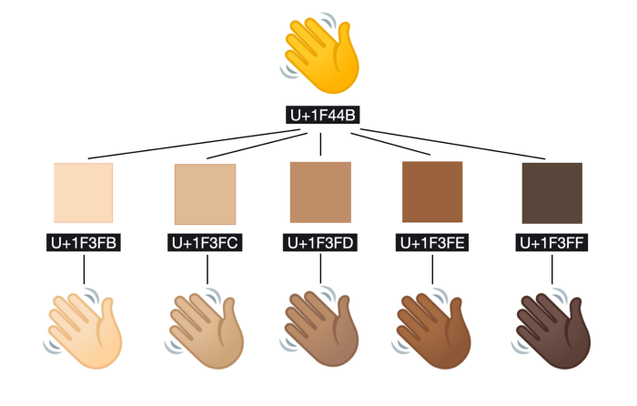 一个字符串就是一组码点,它们通过数字来表示字形,比如字母 'm' 或者数字 '1'。Emoji 同样有对应的码点——您可以在 Emojipedia 上找到它们,包括我们现在要显示的挥手 emoji。