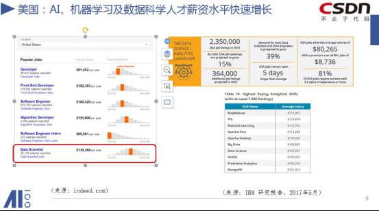 在美国,AI、机器人,机器学习与数据科学人才薪资水平目前快速增长中。你如果是程序员,你的薪资平均水平是九万一千美金,不过图中代表众数(mode)的那根柱子靠左,说明更多的人是略低于这个水平的。这说明少数的超高薪的程序员把多数低工资的程序员给平均了。而算法工程师,尤其是数据科学家,他们整体收入水平很高,均值十三万美元,而且图中代表众数的那个柱字偏右,说明超过这个收入的人群在他们整个这个人群当中也是多数。在招聘网站上,把 AI 方面人才的广告挂出去,5天时间招不到人,显著高于其他职业。意味着什么?供不应求。这个是美国的情况。