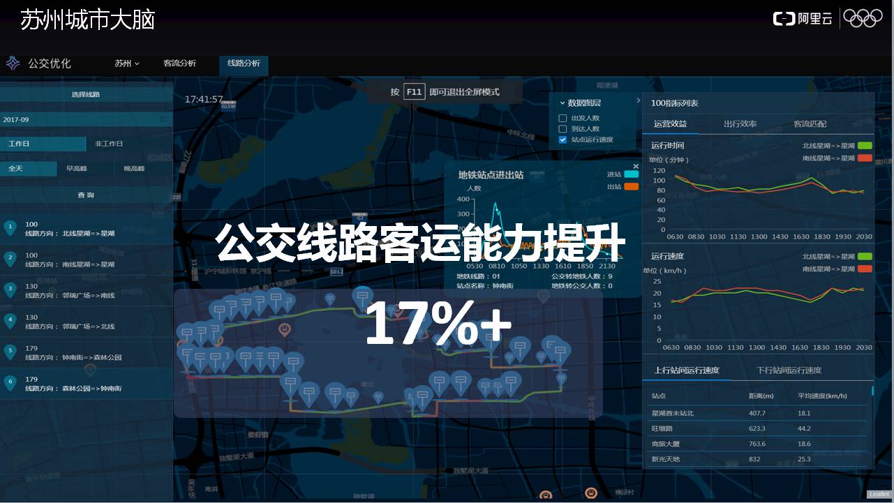 经济发展之外,苏州老百姓的生活也在悄然发生变化。ET城市大脑对苏州的公交车数据、高德数据、运营商数据等进行分析,改变公交车的固定发车时间,灵活排班,工业区试点的两条公交线客流量已经分别增加17%和10%,大大提高了老百姓的通勤效率。