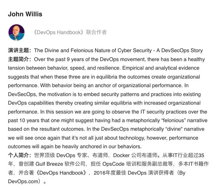 11月4日,没错~11月4日 深圳,DevSecOps Days 首度来华,全球 DevOps 领军人物、布道师,Docker 公司布道师 John Willis 将作为主咖亲自为你分享 The Divine and Felonious of Cyber Security - A DevSecOps Story 的精彩议题,敬请期待!