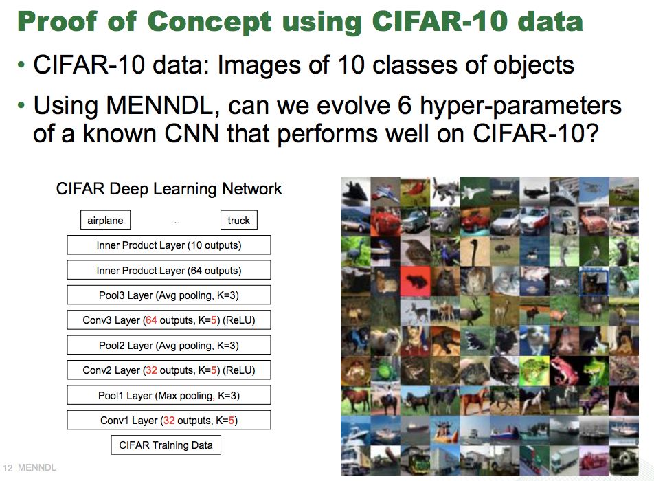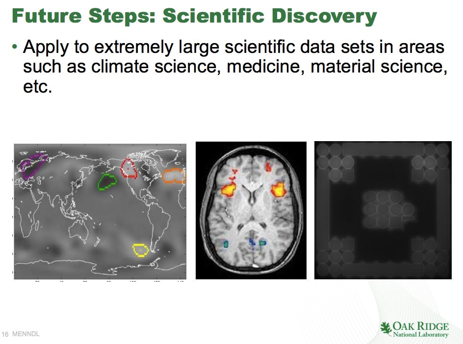 MENNDL曾应用在费米国家加速器实验室的粒子物理实验中。费米实验室的研究人员对中微子和高能亚原子粒子很感兴趣,这些粒子很少与正常物质相互作用,但可能是理解宇宙形成早期的关键。费米实验室的一个实验涉及到一种中微子相互作用的“快照”。