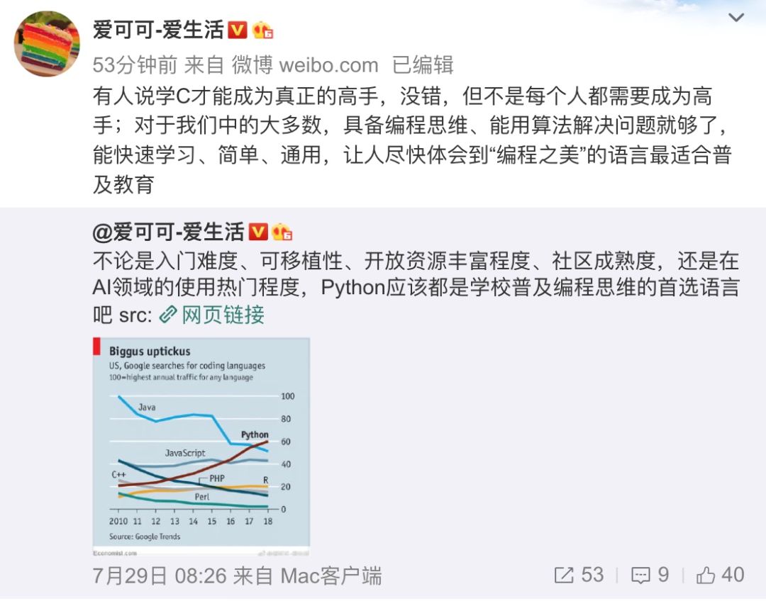 学界大咖微博博主爱可可老师也对Python这一编程语言做出了如此评价。