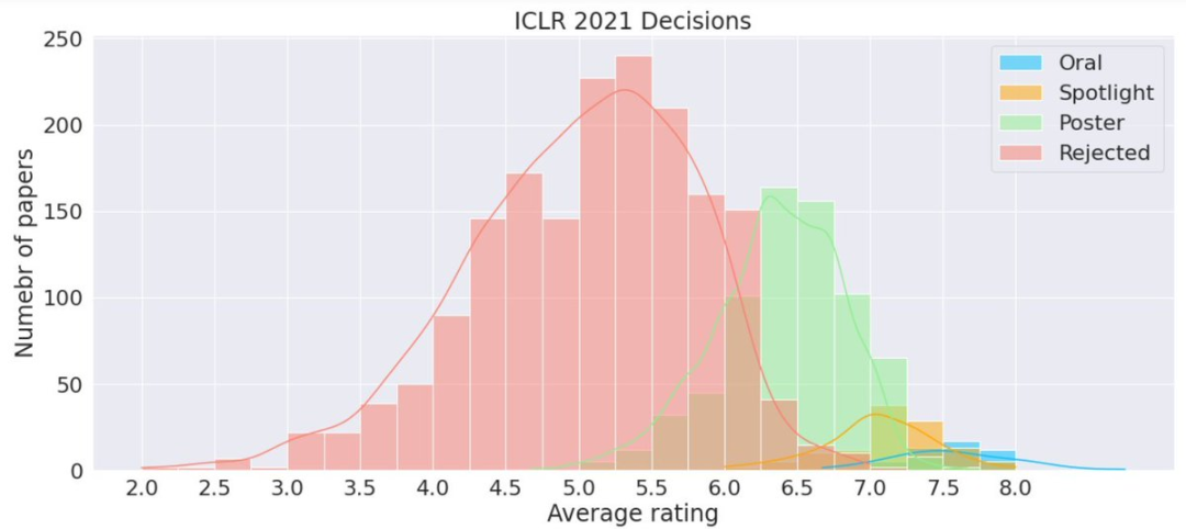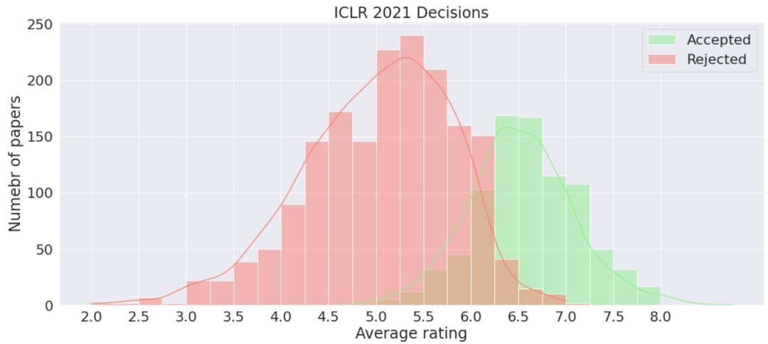 3、平均得分为7分的论文一共有109篇,其中有两篇被拒绝,这表示就算论文平均分达到了7分也不意味着百分百被录取。