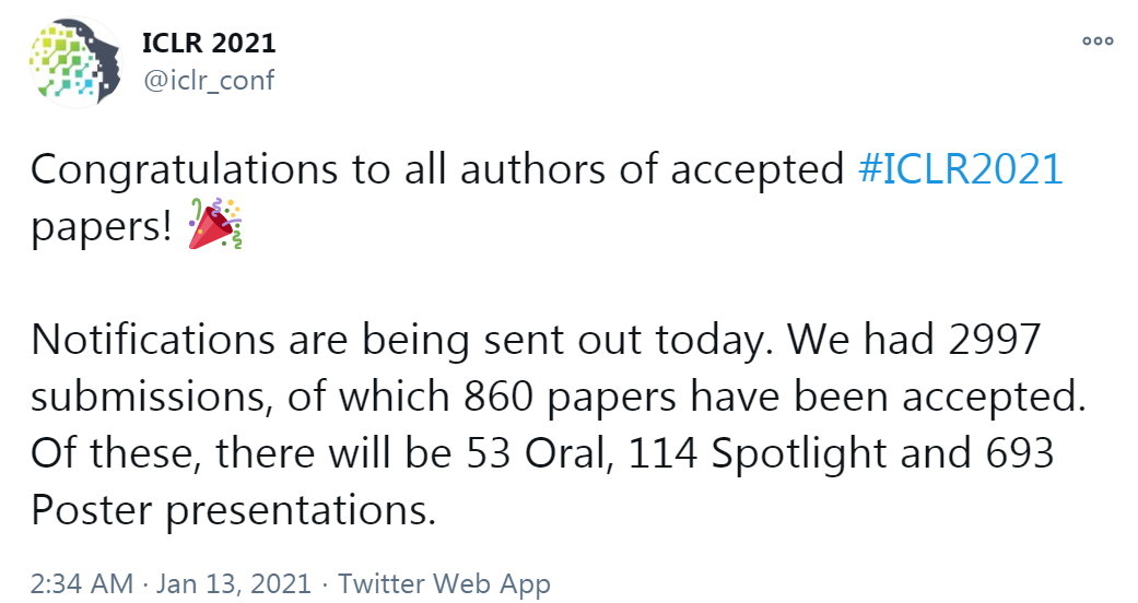 本次ICLR 2021一共有2997篇有效论文投稿,最后一共