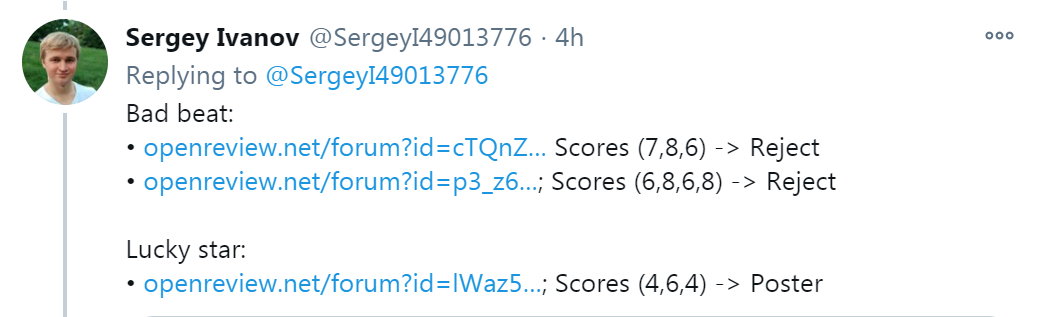 之后Sergey Ivanov简单的指出了有得分为7,8,6和6,8,6,8的论文被拒绝,而得分为4,6,4的论文被幸运接收。