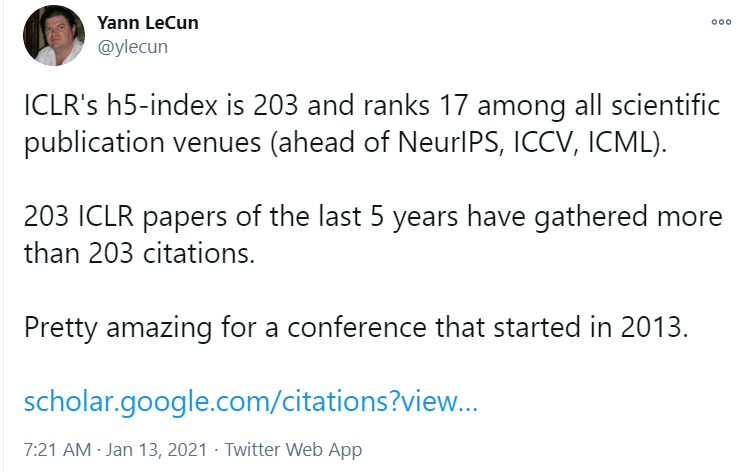 “ICLR的h5指数为203,在所有科学出版物中排名第17,超过了NeurIPS、ICCV和ICML(在AI顶会中仅落后于CVPR,该榜单的前三名是 Nature、新英格兰医学杂志和 Science。)。在过去五年中有203篇论文获得了超过203个引用,这对于一个从2013年才开始的会议来说,取得的成绩可谓是令人惊叹”。