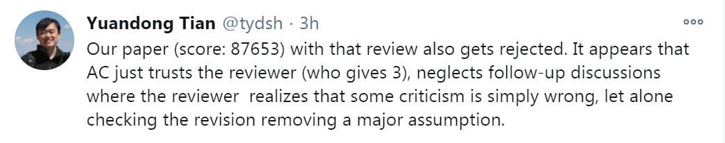 田渊栋随后又说道,他们的另一篇得分为8,7,6,5,3的论文也被拒绝了,似乎AC只信任给了3分的评审,而忽略了后续的一些讨论(一些评审后来意识到有些针对论文的批评是完全错误的,更不用说后来检查修订删除了一个主要的假设)。