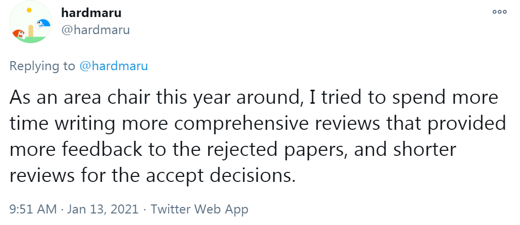 作为本次ICLR 2021的一位领域主席,我尝试花费更多的时间来撰写相对复杂详细的评审回复,以给被拒绝的论文更多的反馈,同时给被能接收的论文相对较短的评审回复。
