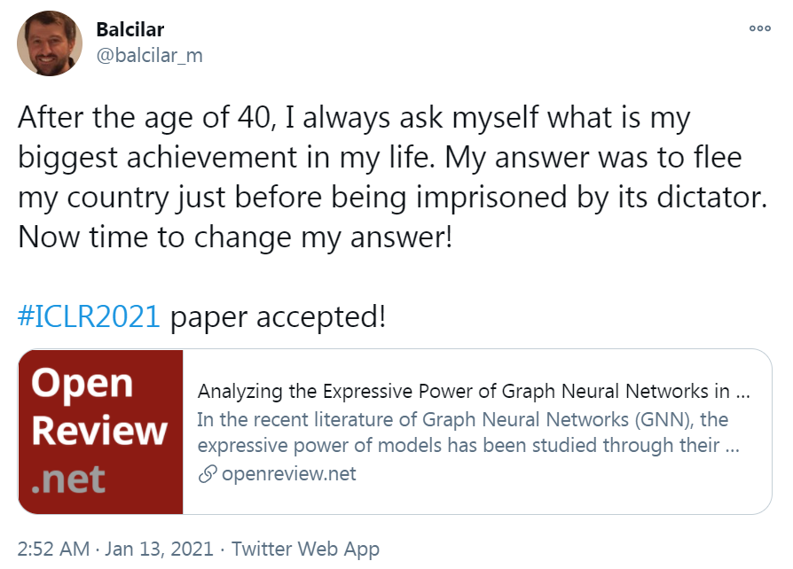 机器学习研究员Balcilar在得知自己的论文被ICLR 2021录取之后甚至表示:“在我四十岁之后,我总是问自己我这一生中最大的成就是什么,我之前的答案是是在被独裁者监禁之前逃离我的国家。现在是时候改变我的答案了!