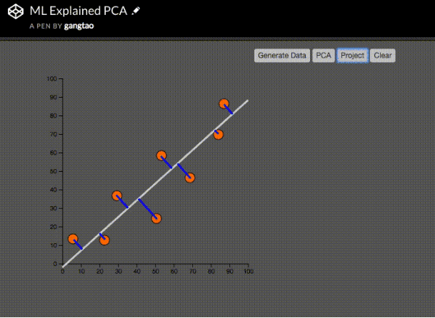这里我们先用鼠标随机生成8个数据点,然后绘制出表示主成分的白色直线。这根线就是二维数据降维后的主成分,蓝色的直线是数据点在新的主成分维度上的投影线,也就是垂线。主成分分析的数学意义可以看成是找到这根白色直线,使得投影的蓝色线段的长度的和为最小值。