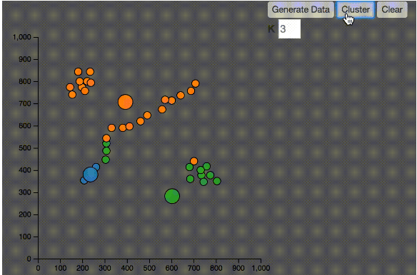 2、由于中心点的初始位置是随机的,有可能并不能正确分类,大家可以在我的Codepen中尝试不同的数据