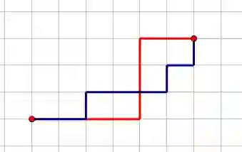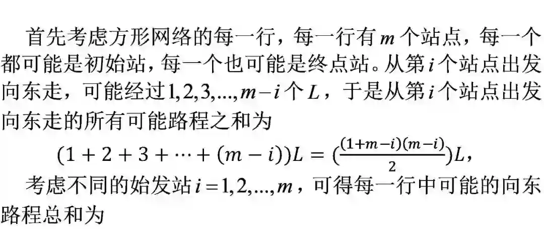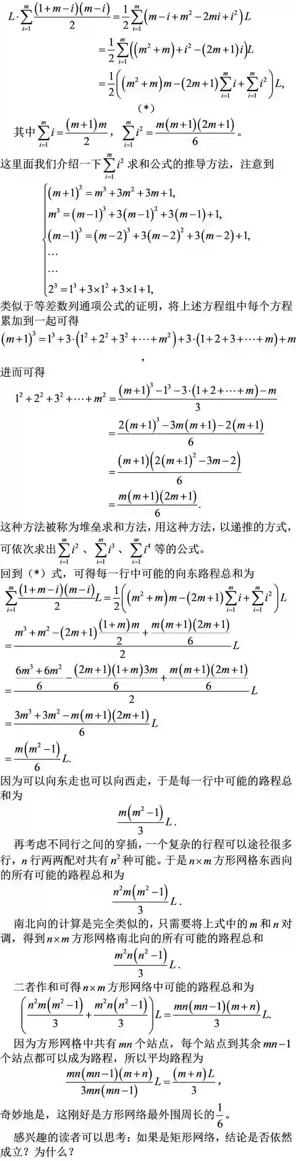 。现在的问题是:从该城市中一个站点到另一个站点的平均长度为多少?这里不允许走回头路,也不允许兜圈子(即,只允许向目的地行进,不能走过了再返回来这样故意浪费行程),这样在方形网络中,一来从一个站点到另一个站点的不同走法对应相同的路程,于是可以假设不同行的站点之间只走一个“之”字形。