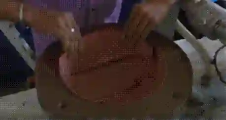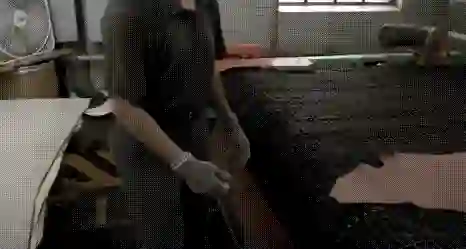 工人们一开始先是把天然橡胶做成的人造革折叠好,做成橄榄形状