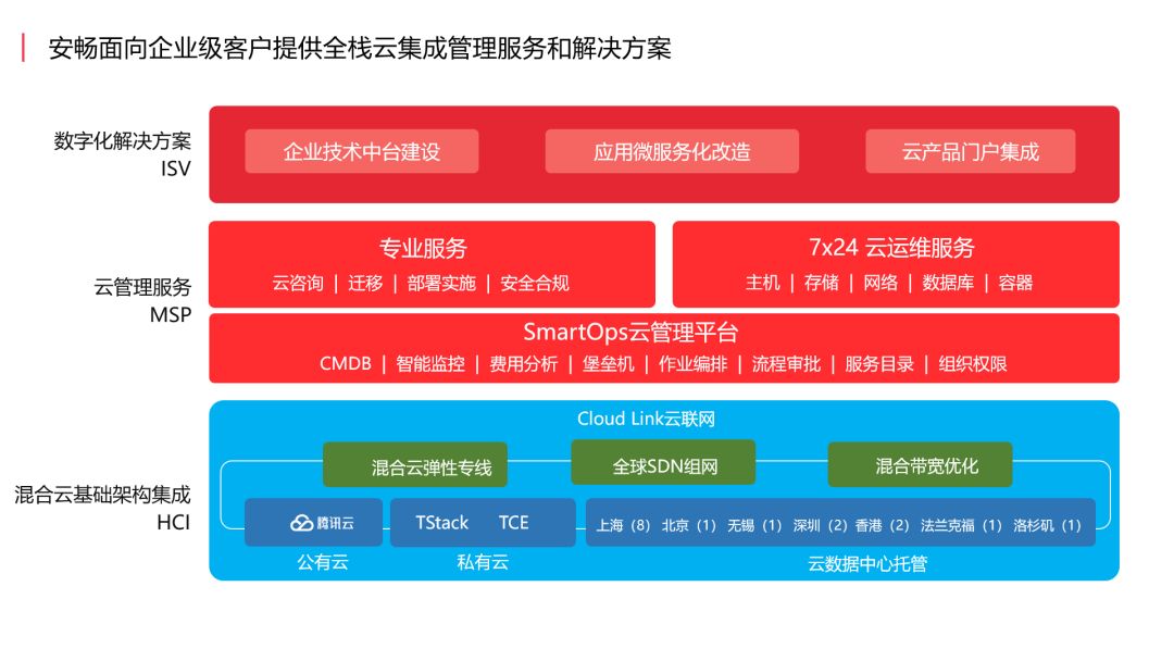 安畅网络走上成为下一代MSP的道路,是偶然也是必然。成立于2007年的安畅网络,在数据中心和云计算托管领域有十余年的经验,在2017年宣布转型成为中国领先的第三方中立云管理服务商,面向中大规模企业数字化转型,提供一站式云咨询、云集成、云管理和云应用开发架构服务,并与国内外主流公有云建立战略合作关系。