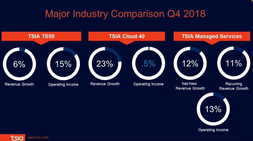 在TSIA的另一项追踪调研中,TSIACloud 40(40家云公司)2018年的营收增长为23%、运营收入为-0.5%,TS50的营收增长为6%、运营收入为15%,而管理服务的纯新收入增长为12%、重复性营收增长为11%、运营收入为13%。