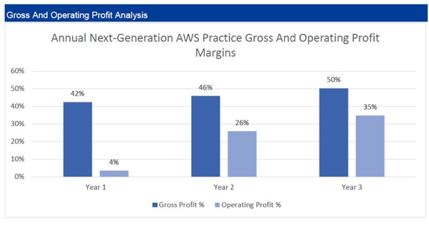 那么,到底什么是下一代MSP呢?来看一下AWS提供的样本。早在2017年的时候,AWS就委托Forrester对AWS的8个管理服务合作伙伴的下一代MSP业务模式进行了一次访谈,得出了一个三年期的经济模型。在下一代MSP的业务经济模型中,AWS管理服务合作伙伴的毛利率从第一年起步阶段的42%增长到第三年的50%,而运营利润则大幅从第一年的4%增长到第三年的36%,投资回报率达到144%!