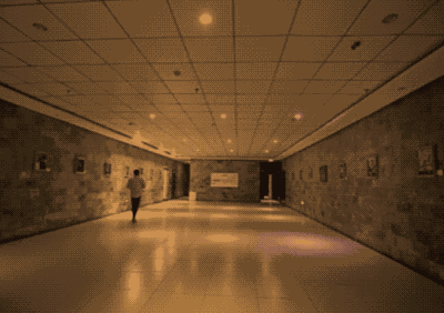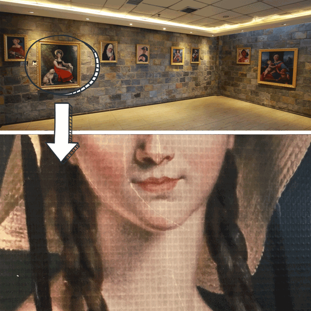 顺着教室走廊往里走,手机信号会渐渐减弱,过道墙上每间隔一米就展示着一副世界名画,我们原以为那是学生临摹的作品,但走近一看,这些世界名画都是用塑料布打印下来的,灯光一打便有强烈的反光效果,近看甚至能看到塑料布粗糙的像素颗粒。