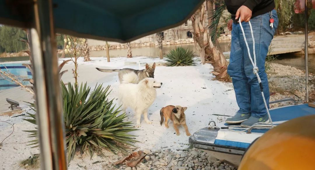 “海”中央还两个小岛,一个上面有荷兰风车,另一个则有超大泳池和三条中华田园犬。