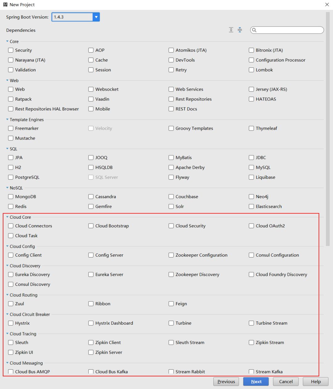 点击Next,进入选择Spring Boot版本和依赖管理的窗口。在这里值的我们关注的是,它不仅包含了Spring Boot Starter POMs中的各个依赖,还包含了Spring Cloud的各种依赖。