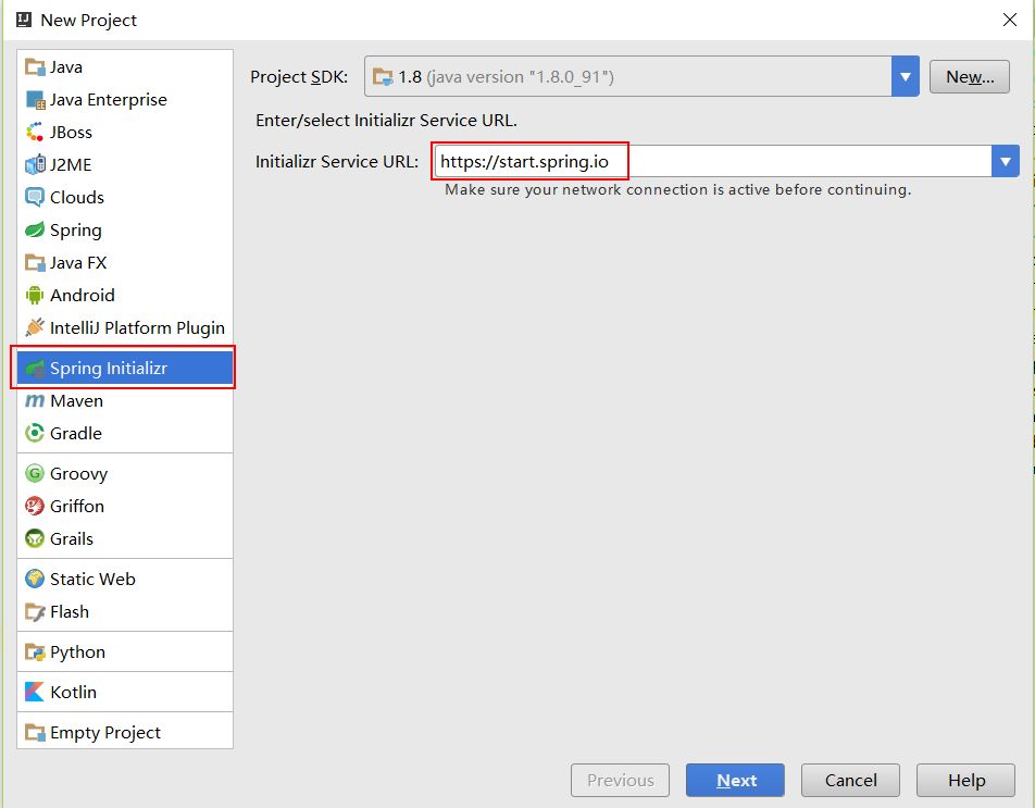 菜单栏中选择File=>New=>Project..,我们可以看到如下图所示的创建功能窗口。其中Initial Service Url指向的地址就是Spring官方提供的Spring Initializr工具地址,所以这里创建的工程实际上也是基于它的Web工具来实现的。