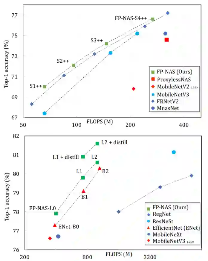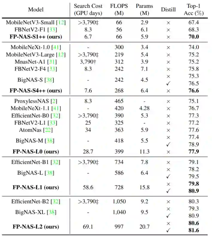 FP-NAS与PARSEC相比,它可以减少64%的架构采样,搜索速度提高2.1倍。与FBNet-V2相比,FP-NAS的速度提高了1.9-3.6倍,并且搜索的模型优于ImageNet上的FBNet-V2模型。FP-NAS允许将FBNet-V2空间扩展至更宽(即更大的通道选择)和更深(即更多的块),同时添加Split-Attention Block并启用对拆分数目的搜索。搜索大小为0.4G FLOPS的模型时,FP-NAS比EfficientNet快132倍,并且搜索到的FP-NAS-L0模型比EfficientNet-B0精确度高0.6%。在不使用任何架构替代或扩展技巧的情况下直接搜索高达1.0G FLOPS的大型模型。同时FP-NAS-L2模型具有简单的蒸馏功能,比BigNAS-XL的蒸馏性能高出0.7%,而FLOPS却更少。