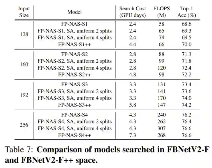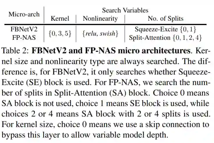 为了证明所提方法的搜索效率,作者扩展了微体系结构,在MBConv块中将SE Module替换为Split-Attention(SA),并将其表示为FP-NAS微体系结构(Tabel 2第2行);