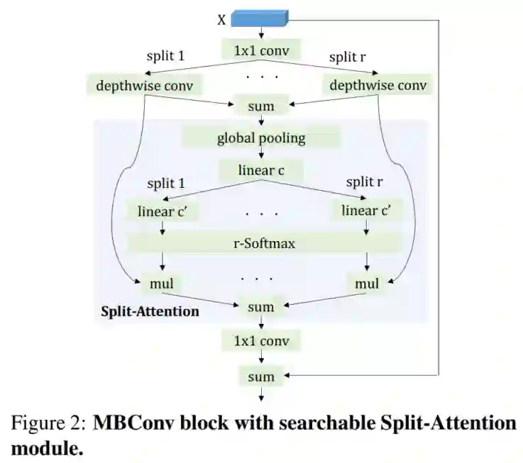 SA模块将SE模块从一个分割扩展为多个分割。然而,在原始手工设计的ResNeSt模型中,选择了固定数量的分割(2、4),并且SA模块在所有ResNeXt块中使用。