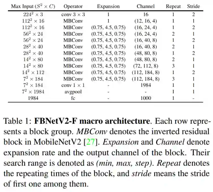 FBNetV2-F-Fine与FBNetV2-F的区别在于,每个MBConv块允许具有不同的微体系结构。FBNetV2-F-Fine包含 架构,比FBNetV2-F大 倍,可以看作是FBNetV2-F Space的细粒度版本。